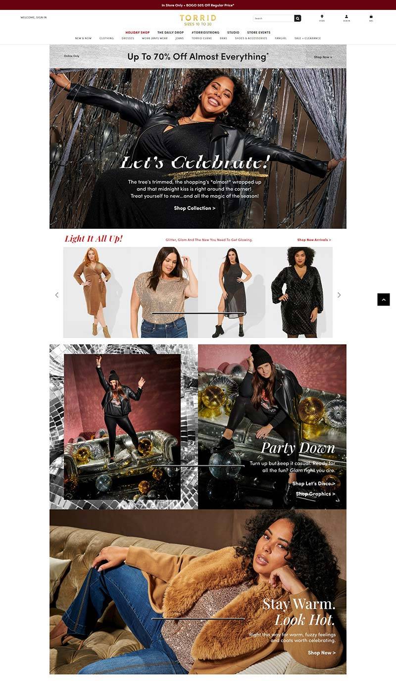 Torrid is an online store that designs trendy fashion clothing and lingerie for young and seductive overweight women. Its sales of oversized fashion clothing cover the latest clothing, underwear, swimsuits, and accessories. The Torred oversized fashion collection inspires women's confidence and encourages them to experience irresistible allure.